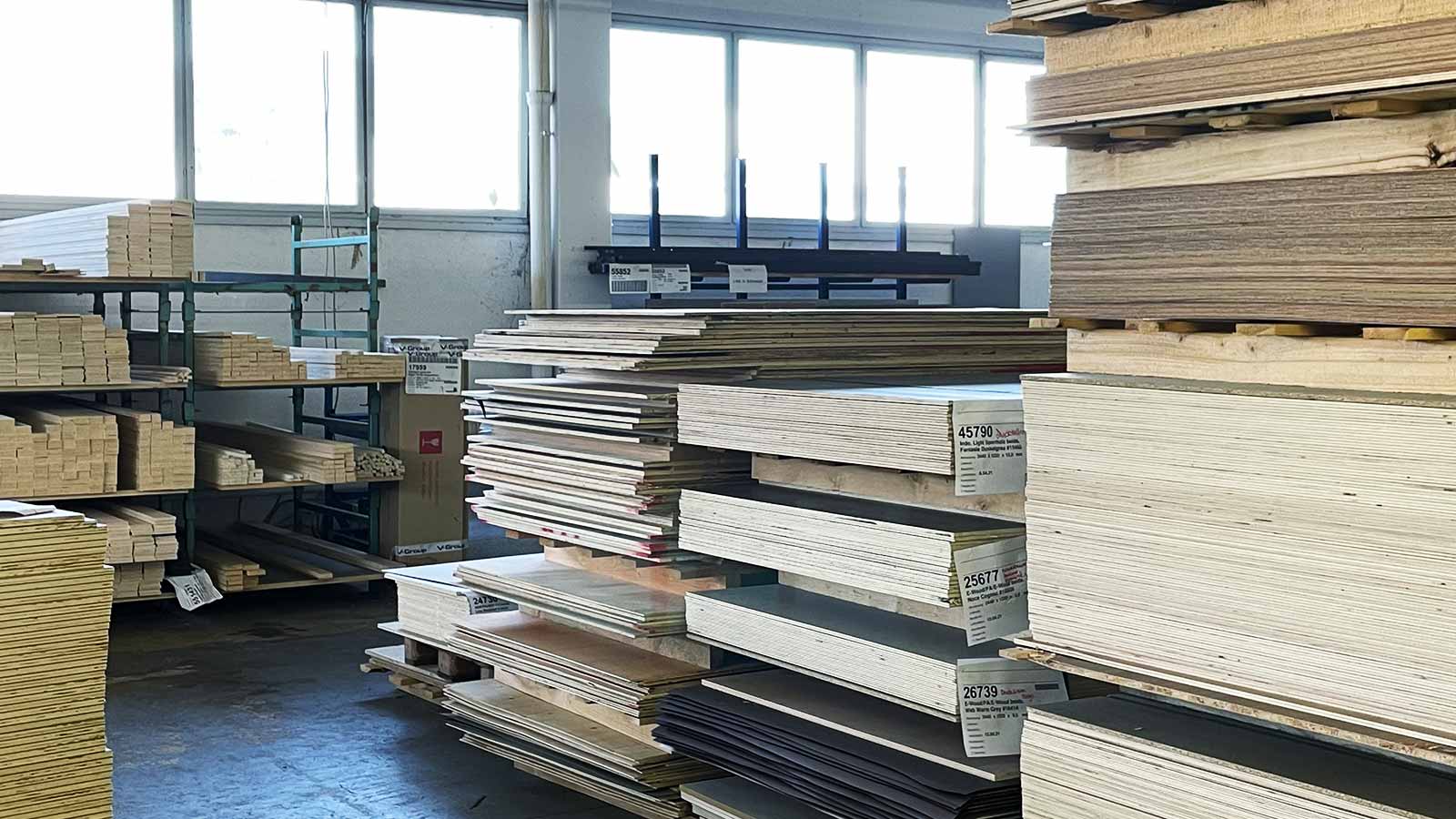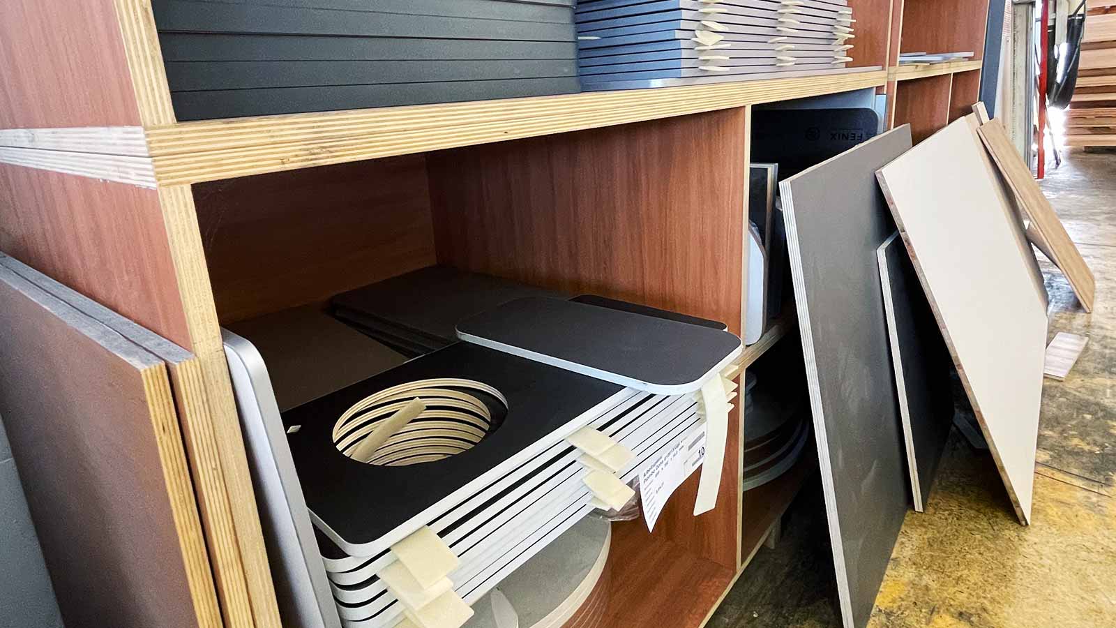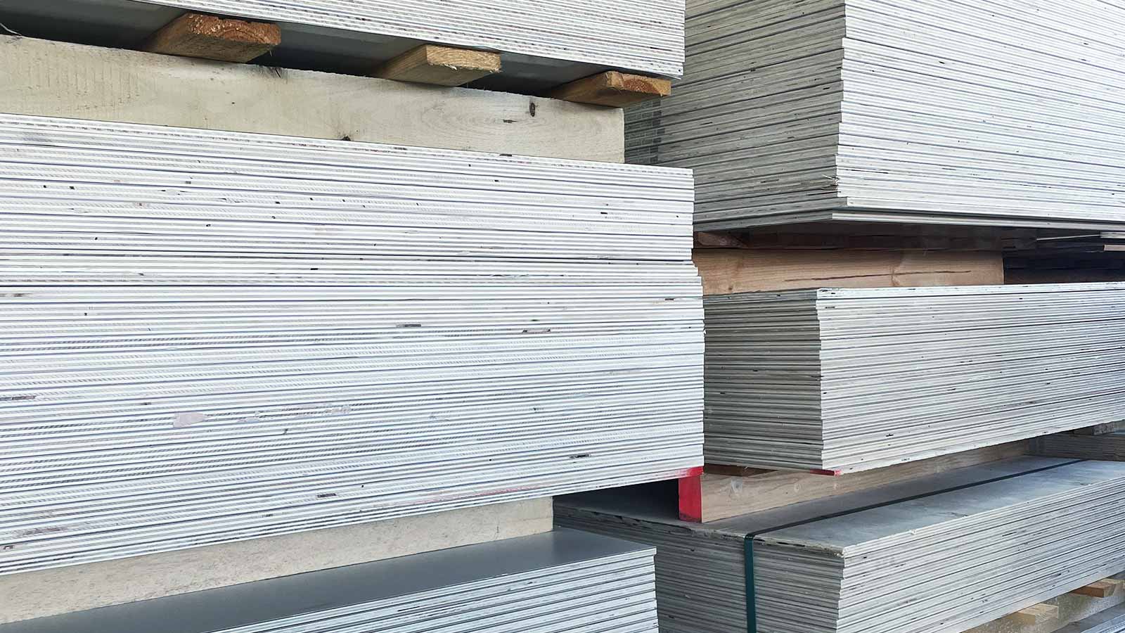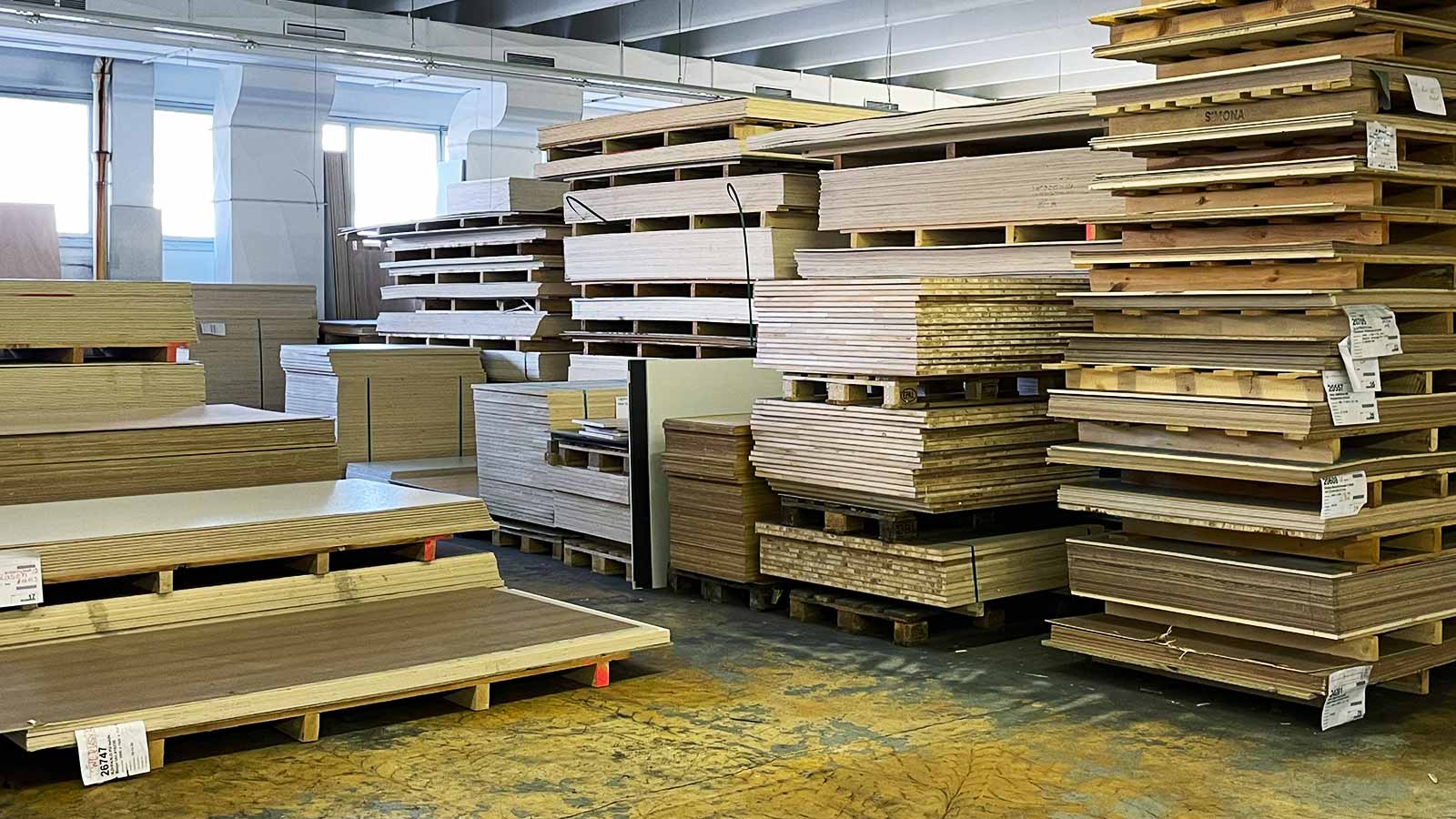 Restbeständen von Holzwerkstoffen, Konstruktionsholz / Sperrholz roh oder beschichtet (auch CPL & HPL) in verschiedenen Stärken / Platten verschiedenster Größen (z. B. Tische oder Arbeitsplatten) / Aluprofile